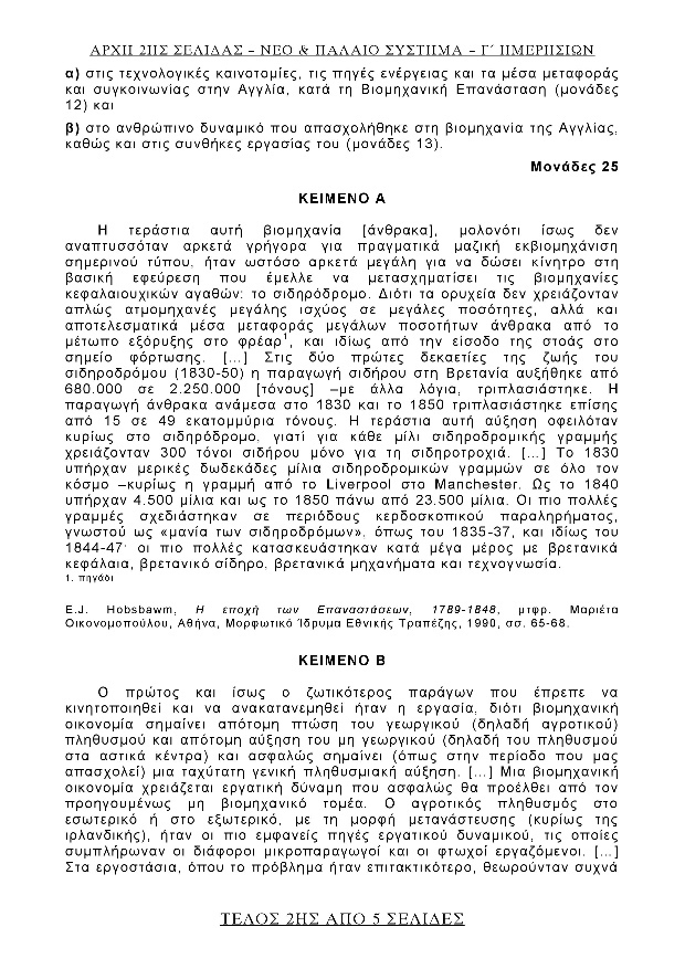 β) Στη δεύτερη ομάδα περιλαμβάνονται δύο (2) τουλάχιστον θέματα που απαιτούν σύνθεση ιστορικών γνώσεων και κριτική ικανότητα (αξιολογήσεις ιστορικών γεγονότων ή ιστορικών προσώπων, ανάλυση αιτιών ή συνθηκών που συντέλεσαν στη διαμόρφωση και εξέλιξη σημαντικών ιστορικών φαινομένων κ.τ.λ.). Στην περίπτωση αυτή μπορούν να χρησιμοποιούνται και ερωτήσεις επεξεργασίας ιστορικού υλικού, το οποίο δίνεται στους υποψηφίους σε φωτοτυπία. Το υλικό αυτό αφορά γραπτές ιστορικές πηγές, εικαστικά έργα, χάρτες, διαγράμματα κ.τ.λ. που χρησιμοποιούνται ως αποδεικτικά στοιχεία ή ως μέσα άντλησης στοιχείων για την εξαγωγή ιστορικών συμπερασμάτων.