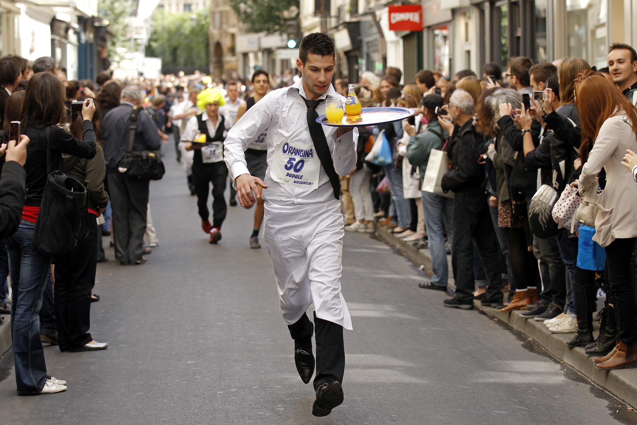 Πάνω από 200 σερβιτόροι από όλη την Ευρώπη διαγωνίσθηκαν τρέχοντας με ένα δίσκο στο χέρι από το Αρχαιολογικό Μουσείο στην Πατησίων μέχρι την Ακρόπολη.