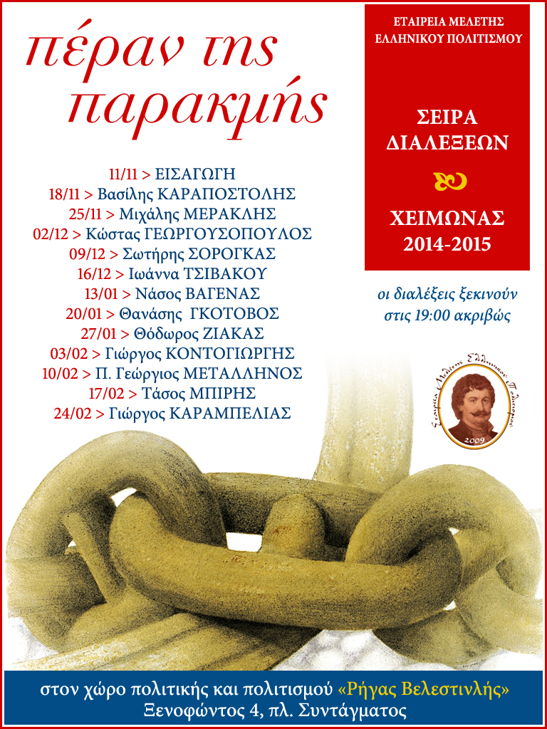 • Εισαγωγή στο πρόγραμμα των διαλέξεων: Σωτήρης Σόρογκας & Γιώργος Καραμπελιάς – 11/11/2014 – Απέναντι σε μια εκθεμελιωτική κρίση, η «επιστροφή»