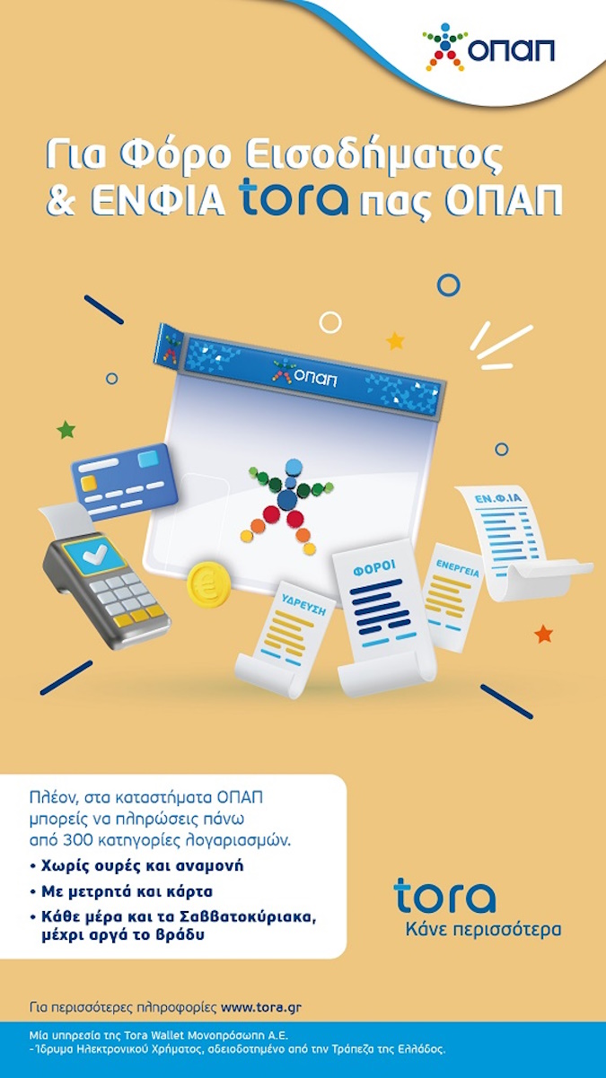 Η προθεσμία για την πληρωμή των δόσεων φόρου εισοδήματος και ΕΝΦΙΑ λήγει αύριο, Παρασκευή 29 Σεπτεμβρίου. Όσοι δεν έχουν προλάβει να τακτοποιήσουν τις οφειλές τους, μπορούν να το πραγματοποιήσουν εύκολα και γρήγορα στα καταστήματα ΟΠΑΠ, μέσω της υπηρεσίας Tora Wallet.