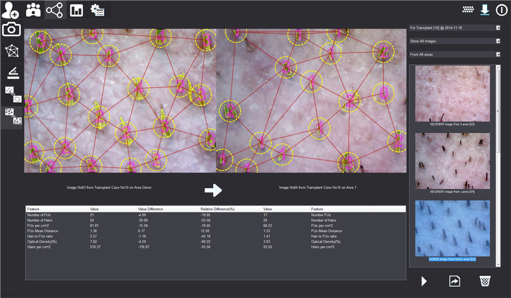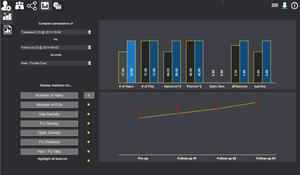 Με την τριχοσκόπηση, μελετώνται τα τριχοθυλάκια ανά τετραγωνικό εκατοστό του τριχωτού της κεφαλής και χάρη στην αυτοματοποιημένη καταμέτρηση που γίνεται από το λογισμικό πρόγραμμα, μπορεί να μάθεις κανείς άμεσα πόσα τριχοθυλάκια υπήρχαν πριν τη μεταμόσχευση μαλλιών, πόσα υπάρχουν μετά, και πόσα από αυτά παράγουν υγιείς τρίχες. Τα αποτελέσματα παρουσιάζονται με στατιστικές μετρήσεις και συγκριτικές εικόνες «πριν και μετά» τη μεταμόσχευση μαλλιών.