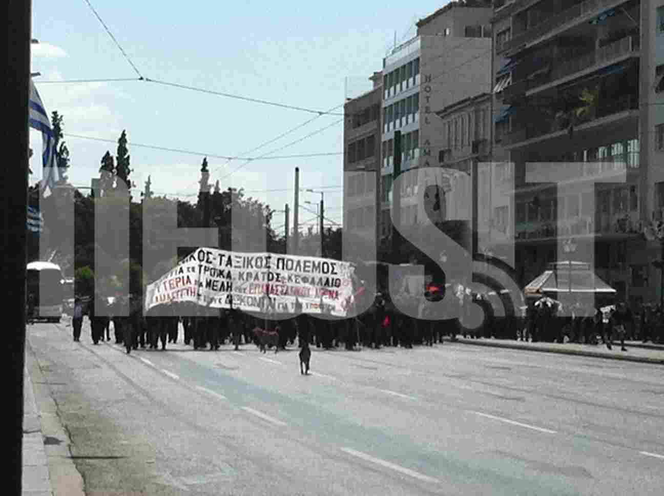 Η συγκέντρωση ξεκίνησε από το Σύνταγμα, έξω από το υπουργείο Οικονομικών, όπου οι νεαροί κυρίως, ντυμένοι με μαύρα ρούχα φώναξαν συνθήματα κατά της κοινωνικής ανισότητας και υπέρ των ταξικών δικαιωμάτων.Μεταξύ των αιτημάτων τους βρίσκεται και η δίκη για τον Επαναστατικό Αγώνα, την οποία θεωρούν άδικη, μιλώντας για “εκτακτα στρατοδικεία”.