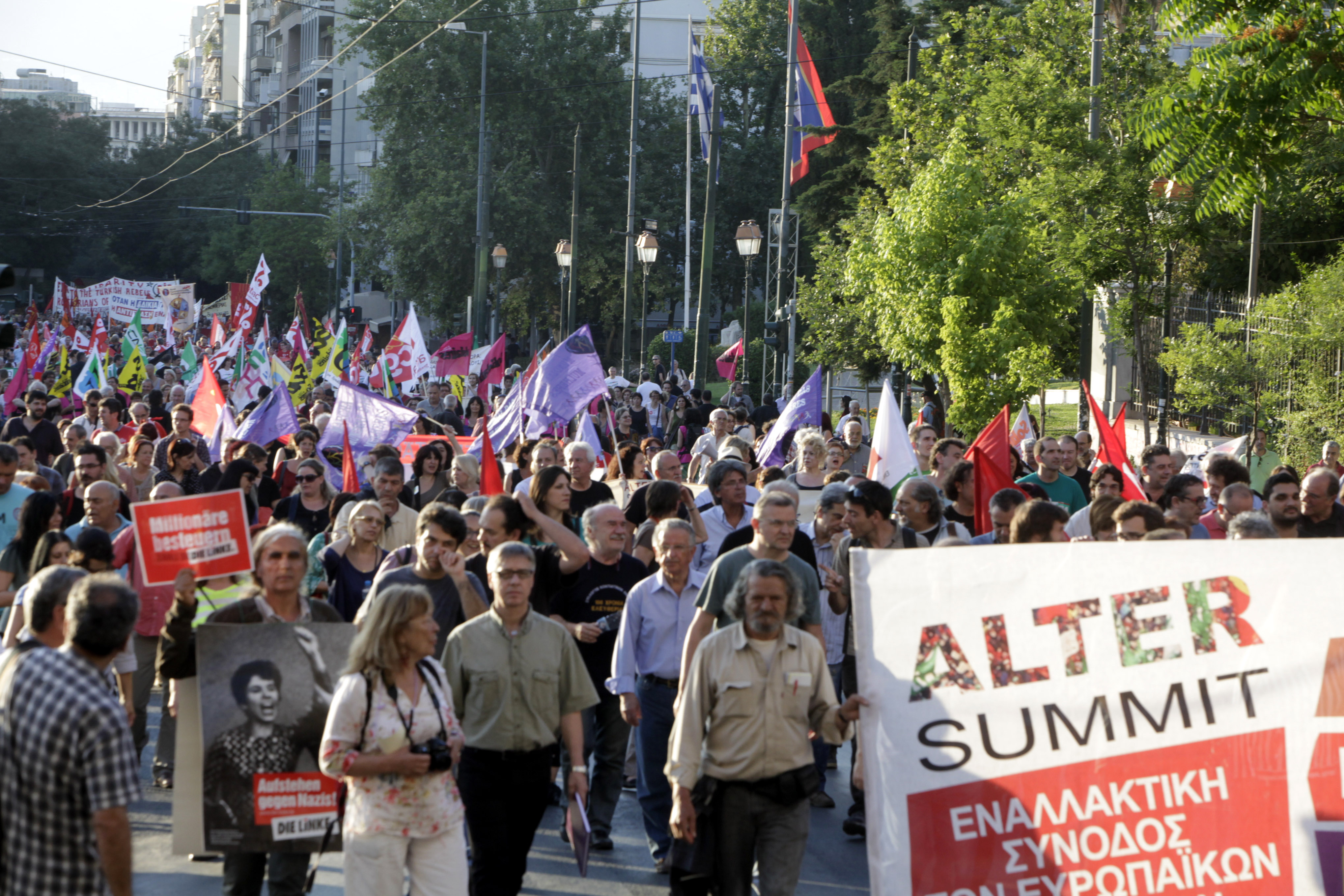 Ολοκληρώθηκε πριν λίγο η πορεία διαμαρτυρίας κατά της λιτότητας της εναλλακτικής συνόδου των ευρωπαϊκών κινημάτων "Alter Summit", που ξεκίνησε από το Αρχαιολογικό Μουσείο και κατέληξε στην Πλατεία Συντάγματος.