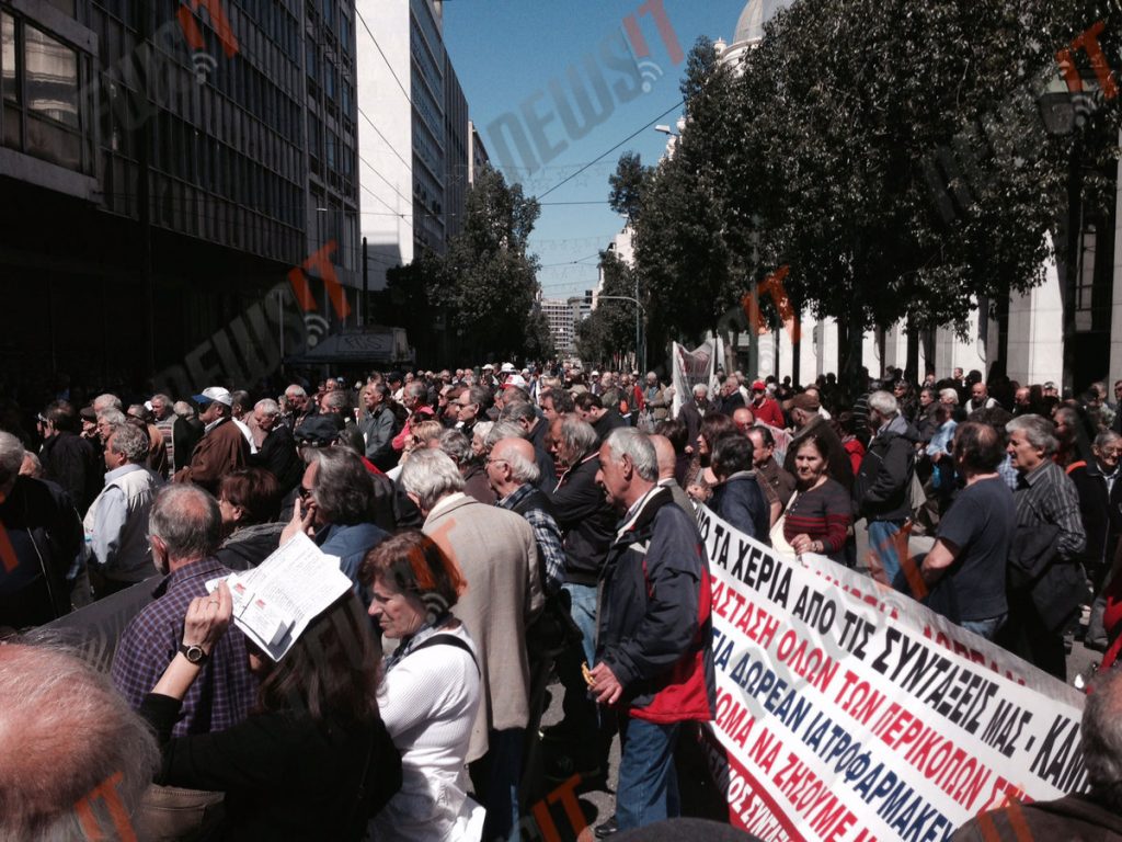 Οι συνταξιούχοι είχαν… δώσει ραντεβού στην πλατεία Κοτζιά και από εκεί ξεκίνησαν πορεία προς το υπουργείο Εργασίας στη Σταδίου. Κόσμος πολύς στη συγκέντρωση των συνταξιούχων, που ζητούν την κατάργηση της ρήτρας μηδενικού ελλείμματος και την επιστροφή των συντάξεων στα επίπεδα προ των περικοπών.