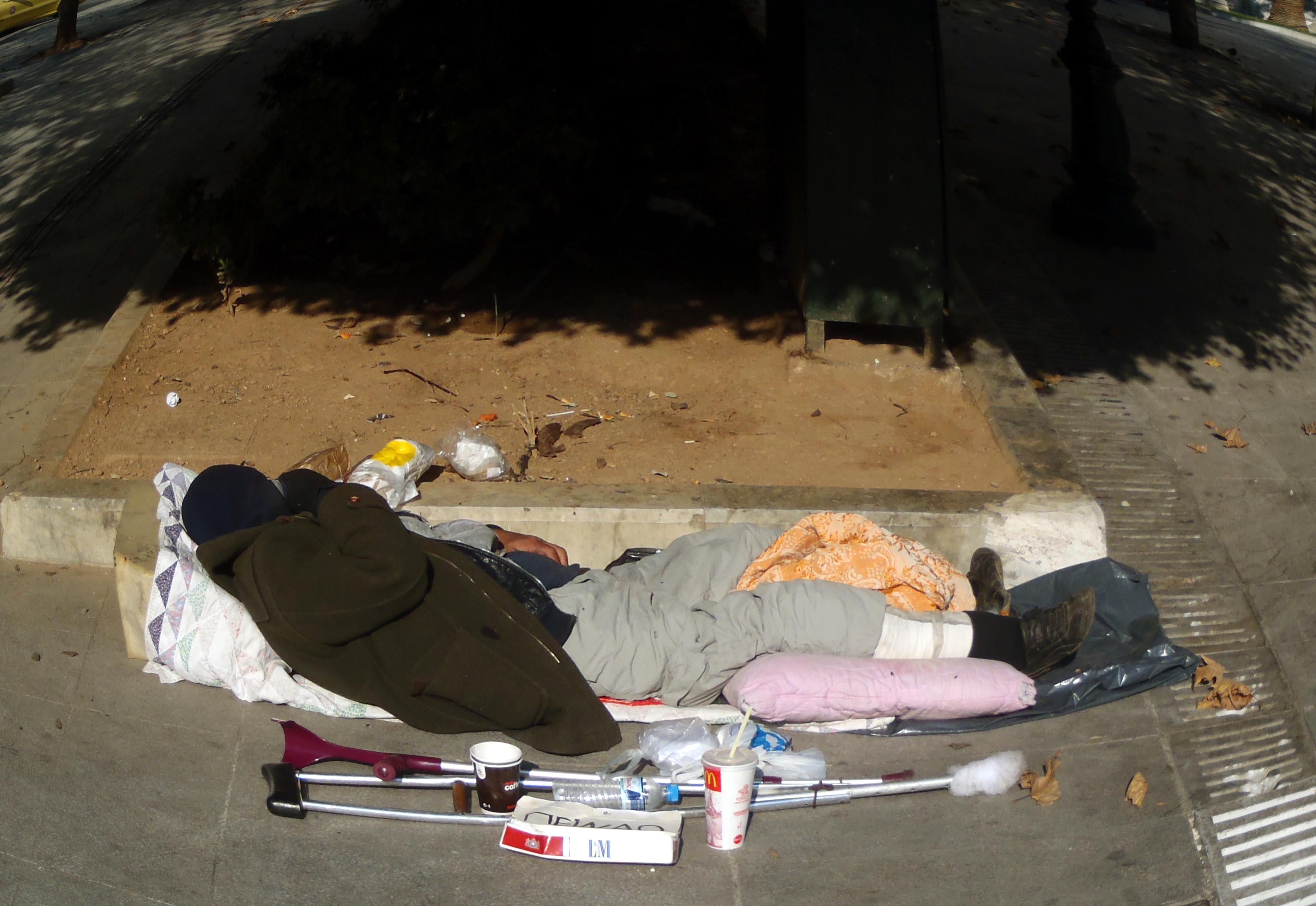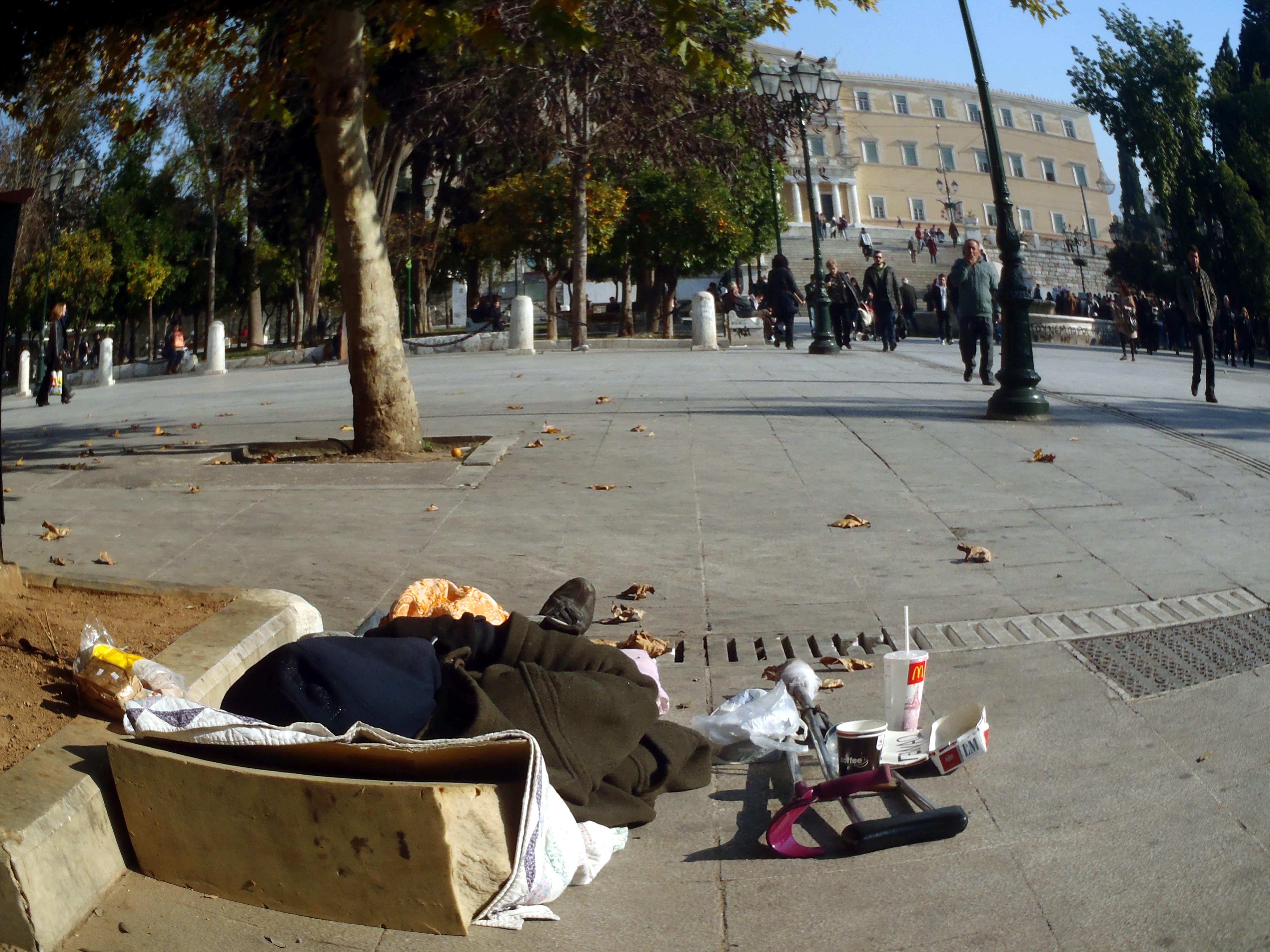 Μοιάζει ένας σωρός με ρούχα αλλά είναι άνθρωπος. Ένας άνθρωπος που έχει στήσει το “σπίτι” του πάνω στην πλατεία, δίπλα μας, μπροστά μας…