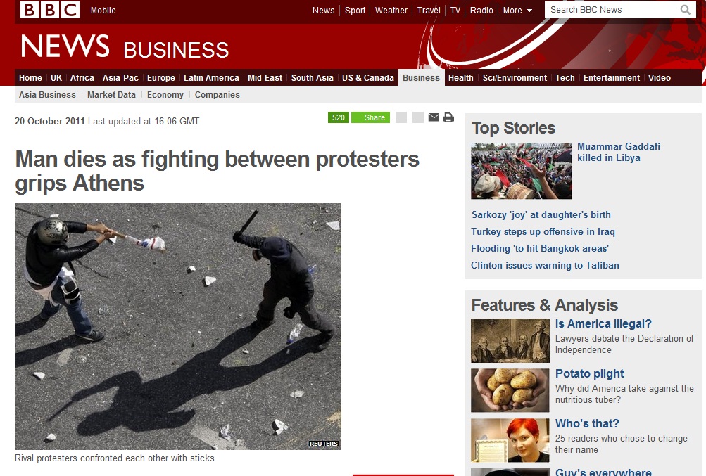 Το BBC αναφέρει ότι ένας άνθρωπος πέθανε παλεύοντας ανάμεσα στους διαδηλωτές που περικύκλωσαν το κέντρο της Αθήνας.