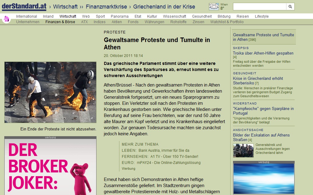H αυστριακή εφημερίδα “Der Standard” αναφέρει σε δημοσίευμά της για τον “θάνατο ενός 53χρονου διαδηλωτή ο οποίος μεταφέρθηκε ήδη νεκρός σε κεντρικό νοσοκομείο της Αθήνας”.