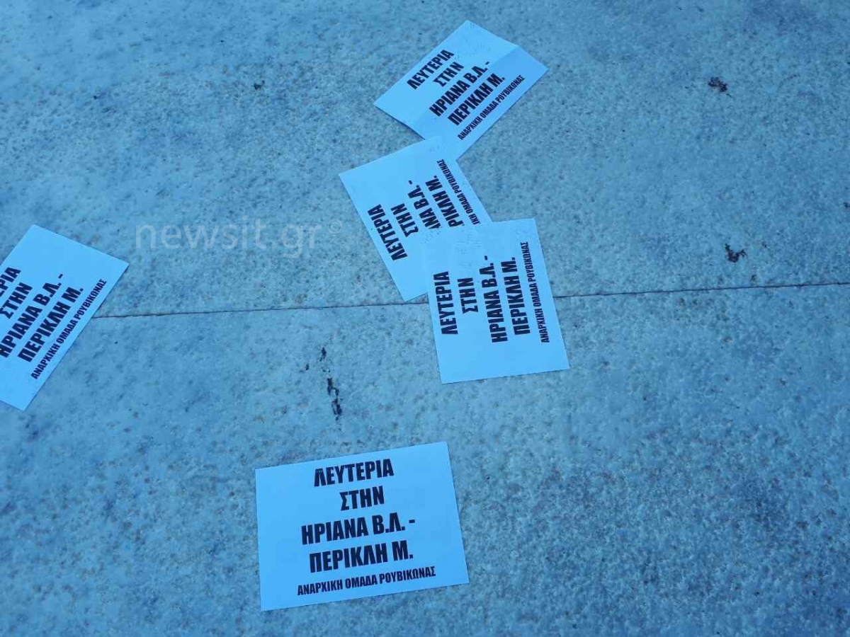 Τα “τρικάκια” που πέταξαν έγραφαν «ΑΔΕΙΕΣ ΣΤΟΥΣ ΠΟΛΙΤΙΚΟΥΣ ΚΡΑΤΟΥΜΕΝΟΥΣ. ΑΝΑΡΧΙΚΗ ΟΜΑΔΑ ΡΟΥΒΙΚΩΝΑ» στη μία τους πλευρά και στην άλλη «ΛΕΥΤΕΡΙΑ ΣΤΗΝ ΗΡΙΑΝΑ Β.Λ.- ΠΕΡΙΚΛΗ Μ. ΑΝΑΡΧΙΚΗ ΟΜΑΔΑ ΡΟΥΒΙΚΩΝΑ».