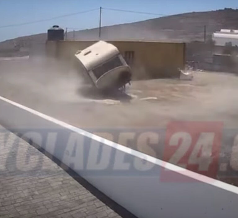Το εντυπωσιακό αλλά και επικίνδυνο περιστατικό σημειώθηκε το μεσημέρι της Παρασκευής (27.06.2025) στο Εμπορείο στη Σαντορίνη, όταν οι ισχυρές ριπές ανέμου σήκωσαν κυριολεκτικά από το έδαφος ένα τροχόσπιτο, παρασύροντάς το αρκετά μέτρα μακριά. Το όχημα περιστράφηκε γύρω από τον άξονά του, πριν καταλήξει πλήρως κατεστραμμένο σε διπλανό σημείο.