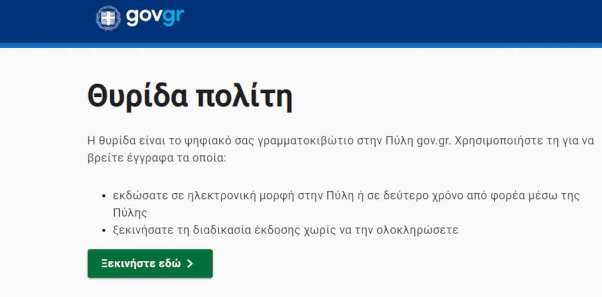 Η θυρίδα λειτουργεί ως ο «ψηφιακός χαρτοφύλακας» του πολίτη, καθώς εκεί συγκεντρώνονται τόσο τα έγγραφα που εκδίδει online μέσω του gov.gr, όσο και τα έγγραφα που εκδίδονται σε δεύτερο χρόνο, κατόπιν ηλεκτρονικής αίτησης του πολίτη προς κάποιον φορέα της δημόσιας διοίκησης μέσω του gov.gr.