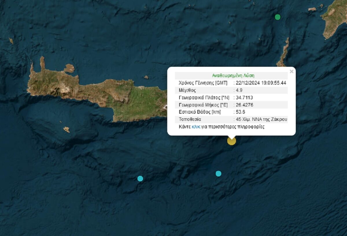 Ισχυρός σεισμός 4,9 Ρίχτερ σημειώθηκε το βράδυ της Κυριακής (22/12/2024) στη θαλάσσια περιοχή στην περιοχή του Ζάκρου στο Λασίθι.