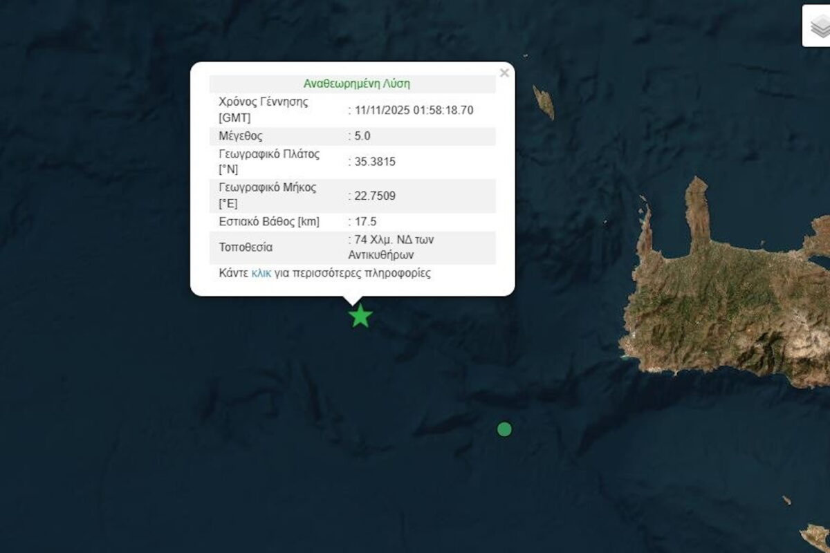 Σύμφωνα με το Γεωδυναμικό Ινστιτούτο του Εθνικού Αστεροσκοπείου Αθηνών, το επίκεντρο του σεισμού εντοπίζεται στον θαλάσσιο χώρο 74 χλμ. νοτιοδυτικά των Αντικυθήρων.