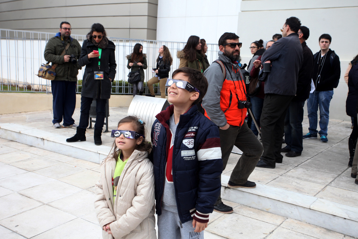 Η ηλιακή έκλειψη, η πρώτη ολική έπειτα από 15 χρόνια, που στο μεγαλύτερο μέρος της Ευρώπης ήταν ορατή ως μερική, εντυπωσίασε περαστικούς, αλλά και όσους βρέθηκαν στο κέντρο της Αθήνας γι’ αυτό τον λόγο, εφοδιασμένοι με τα ειδικά γυαλιά.