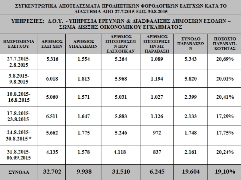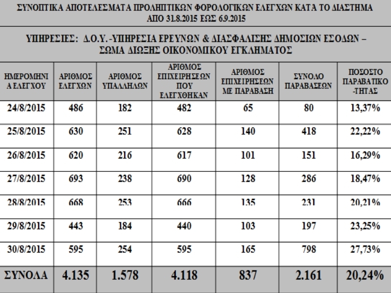 Όπως προκύπτει από την ενημέρωση του υπουργείου Οικονομικών, στο διάστημα που προαναφέραμε έγιναν καθημερινά από 443 έως και 693 έλεγχοι, ενώ πιο αναλυτικά ελέγχθηκαν υπάλληλοι και επιχειρήσεις.