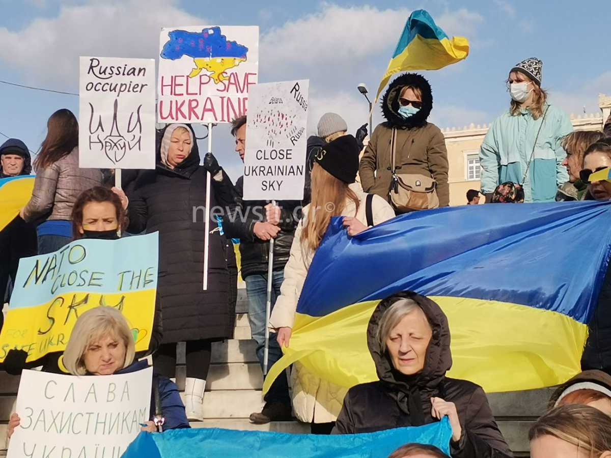 Κυρίως Ουκρανοί που βρίσκονται στην Ελλάδα ήταν εκείνοι που βρέθηκαν στο Σύνταγμα και με πλακάτ και σημαίες της Ουκρανίας στα χέρια, ζήτησαν να σταματήσει ο πόλεμος στη χώρα τους.