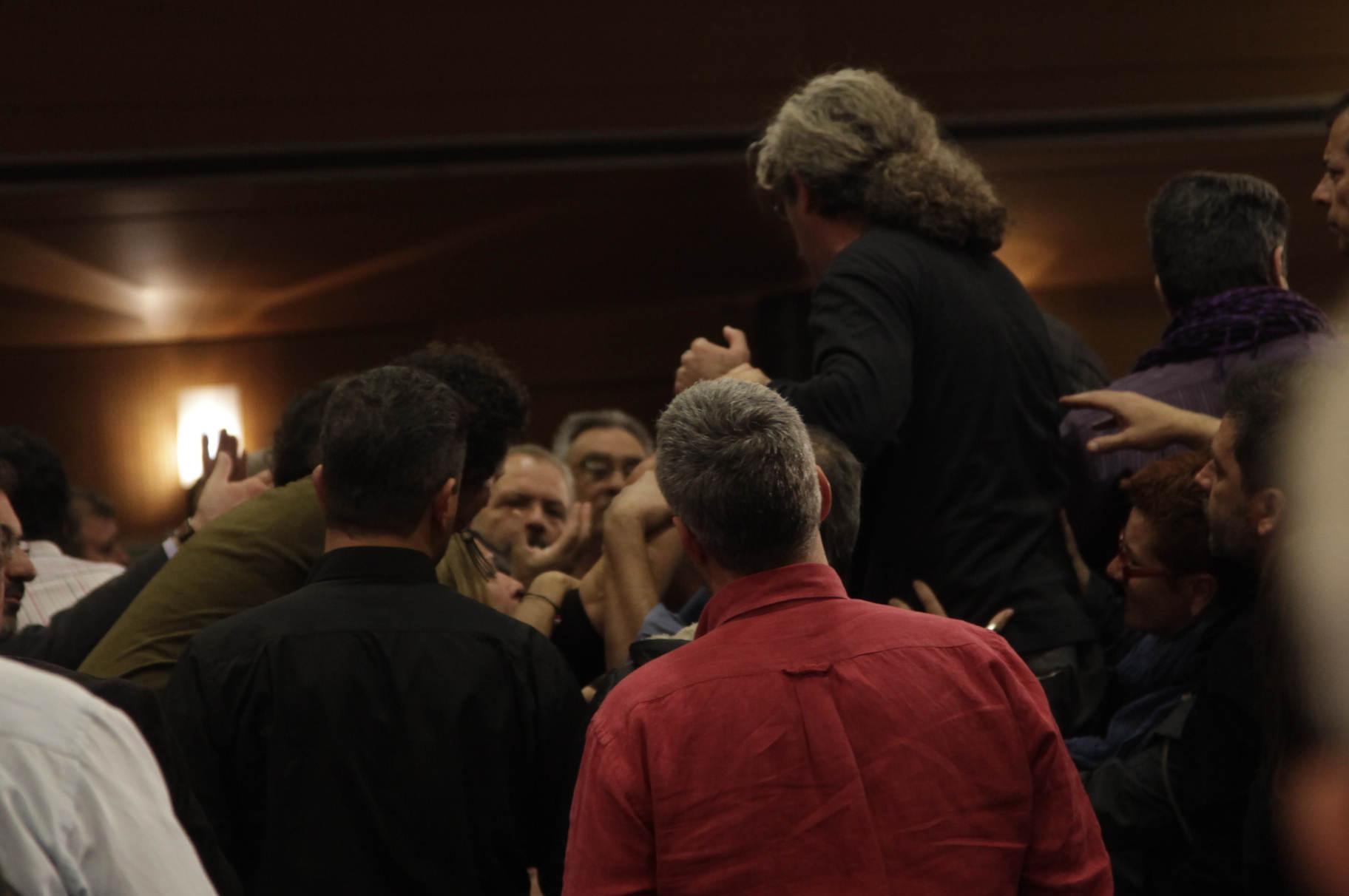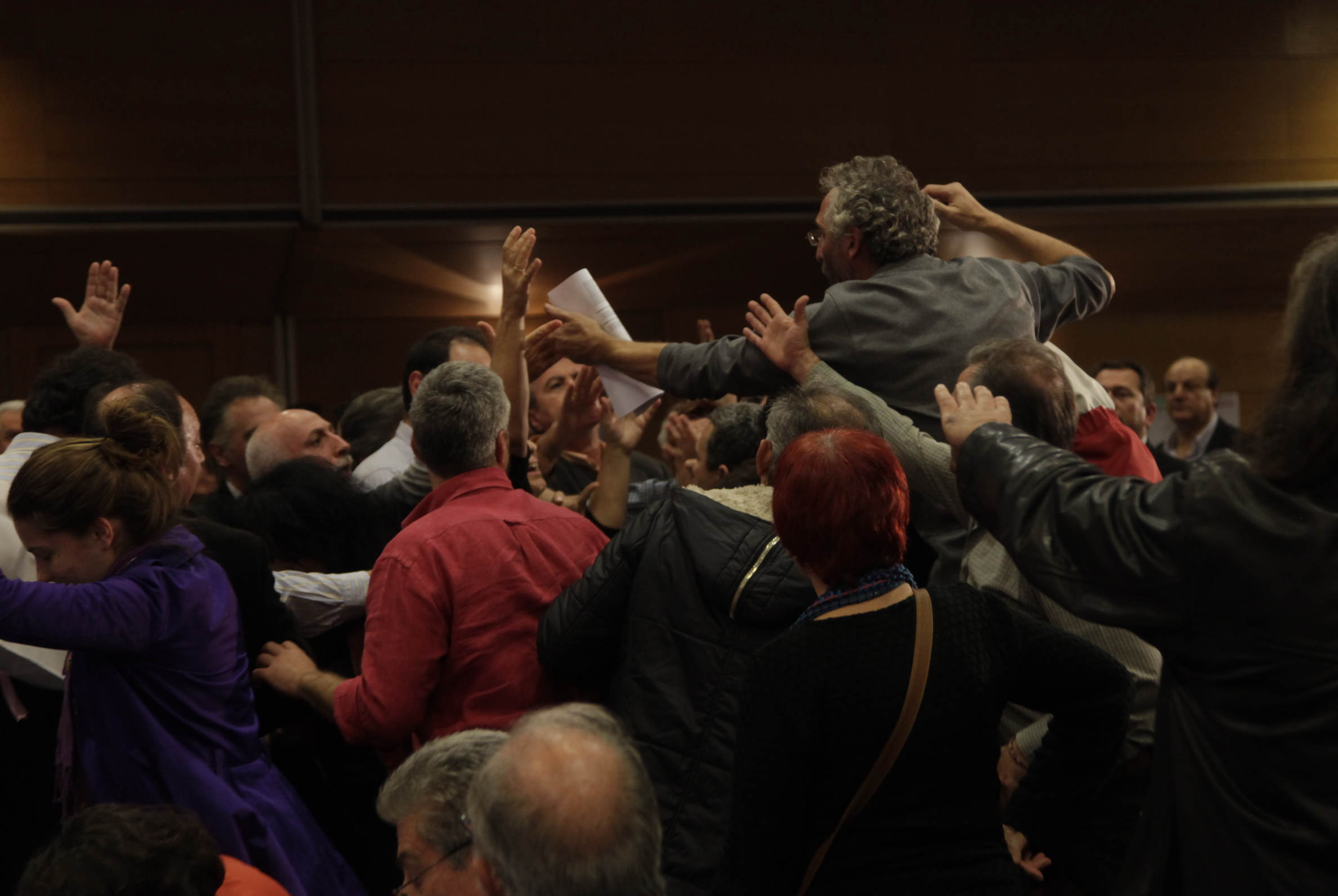 Η ένταση προκλήθηκε για διαδικαστικά θέματα και οι αντεγκλήσεις ξεκίνησαν με αφορμή τις πιστοποιήσεις των ομιλητών, είπαν στο NewsIt άνθρωποι που βρίσκονταν μπροστά στο περιστατικό.