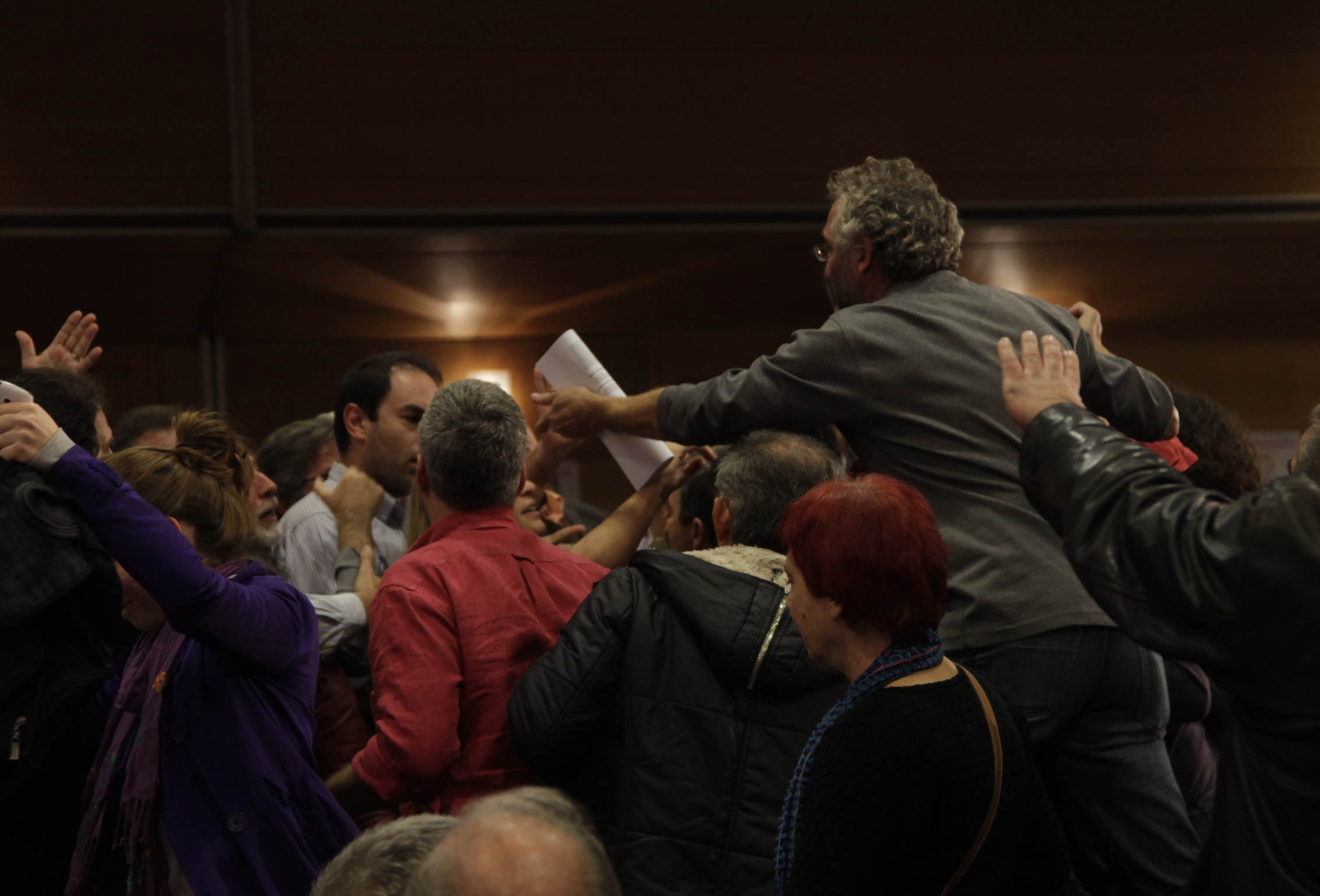 Ο… κακός χαμός έγινε περίπου στις 18:00 το απόγευμα της Πέμπτης, όταν στο βήμα του Συνεδρίου βρίσκονταν ο Γιώργος Χαρίσης, μέλος της Εκτελεστικής Επιτροπής της Συνομοσπονδίας και προσκείμενος στον ΣΥΡΙΖΑ αλλά και ο Δημήτρς Μπράτης, πρώην πρόεδρος της ΔΟΕ.