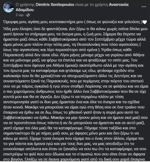 Πάντα θα είσαι το κορίτσι μου, το χαμόγελο μου, τα όνειρα μου. Πάντα θα ανυπομονώ να σε δω, όπως κάθε καθημερινή, που περιμέναμε το Σαββατοκύριακο, απλά τώρα θα πρέπει να περιμένουμε λίγο περισσότερο. Ελπίζω να είσαι καλά, όπου και αν είσαι και κάποια στιγμή να έρθεις να μου το πεις, για να πάψω να ανησυχώ, γιατί πλέον δεν είναι στο χέρι μου να σε κάνω χαρούμενη και να σε προσέξω, όπως έκανα πάντα. Αντίο καρδιά μου. Σε φιλώ και σε περιμένω στην αγκαλιά μου κάθε βράδυ, δική σου είναι όπως σου απαντούσα, όταν με ρωτούσες. Σ’αγαπάω για πάντα!».
