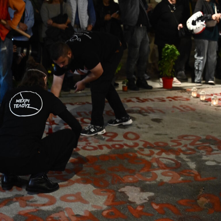 Στη συγκέντρωση, σύμφωνα με το κάλεσμα, συμμετείχαν «ενεργοί πολίτες, συγγενείς των θυμάτων, επιζώντες της μοιραίας αμαξοστοιχίας».