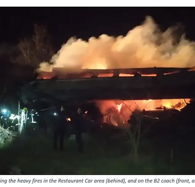 Στις 02:12 μια φωτογραφία (Εικόνα 34) του τόπου του ατυχήματος δείχνει τη μεγάλη φωτιά στο Restaurant Car να μειώνεται, με ακόμα φωτιά και πυκνό καπνό να βγαίνει από τα ερείπια του Restaurant Car και με άλλες δύο μικρές φλόγες να παραμένουν στο μπροστινό και πίσω μέρος του B2coach. Μια προσπάθεια πυρόσβεσης που καταγράφηκε στις 02:32 δείχνει αφρό να αντλείται προς το βαγόνι, χωρίς να είναι σαφές αν έπαιξε ρόλο στην πραγματική κατάσβεση της φωτιάς που είχε ήδη καταναλώσει όλο το μήκος του βαγονιού.