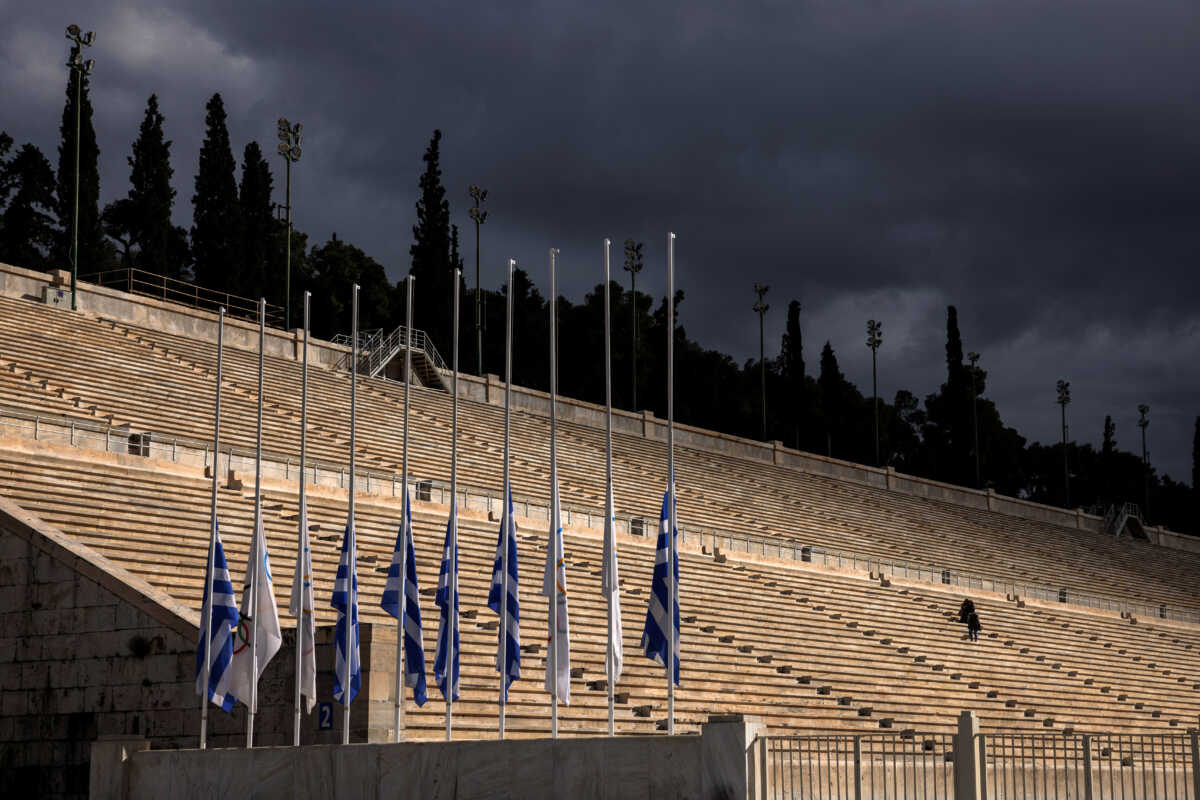 Από νωρίς το πρωί οι επισκέπτες του Καλλιμάρμαρου βλέπουν την ελληνική σημαία αλλά και την ολυμπιακή σημαία να κυματίζουν μεσίστιες.