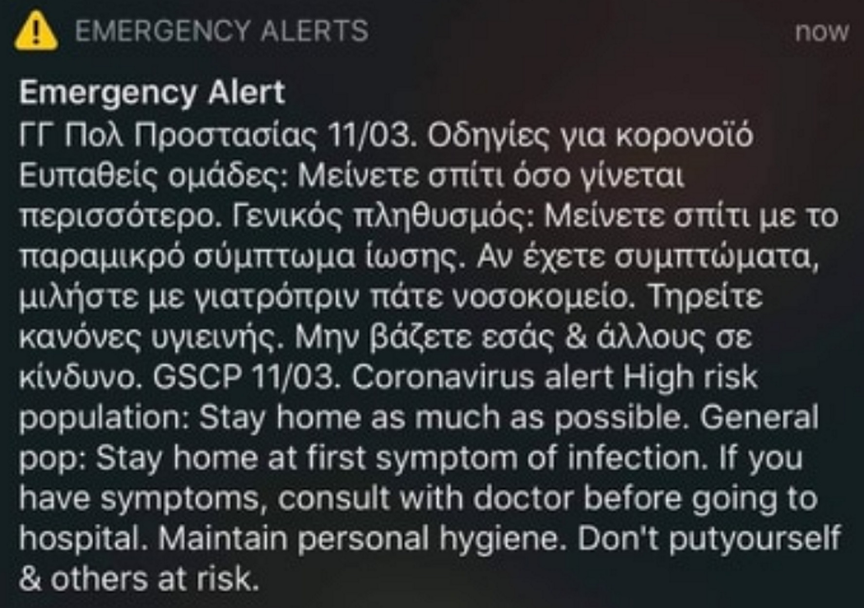 Σημειώνεται ότι η χθεσινή (σ.σ. 11.03.2020) ειδοποίηση ελήφθη κατά κύριο λόγο από όσους έχουν τα λεγόμενα “έξυπνα κινητά” (σ.σ. smartphones), τα οποία διαθέτουν το απαραίτητο λογισμικό με την μέθοδο CBS, δηλαδή μέσω κεραιών κινητής τηλεφωνίας.