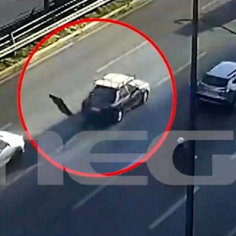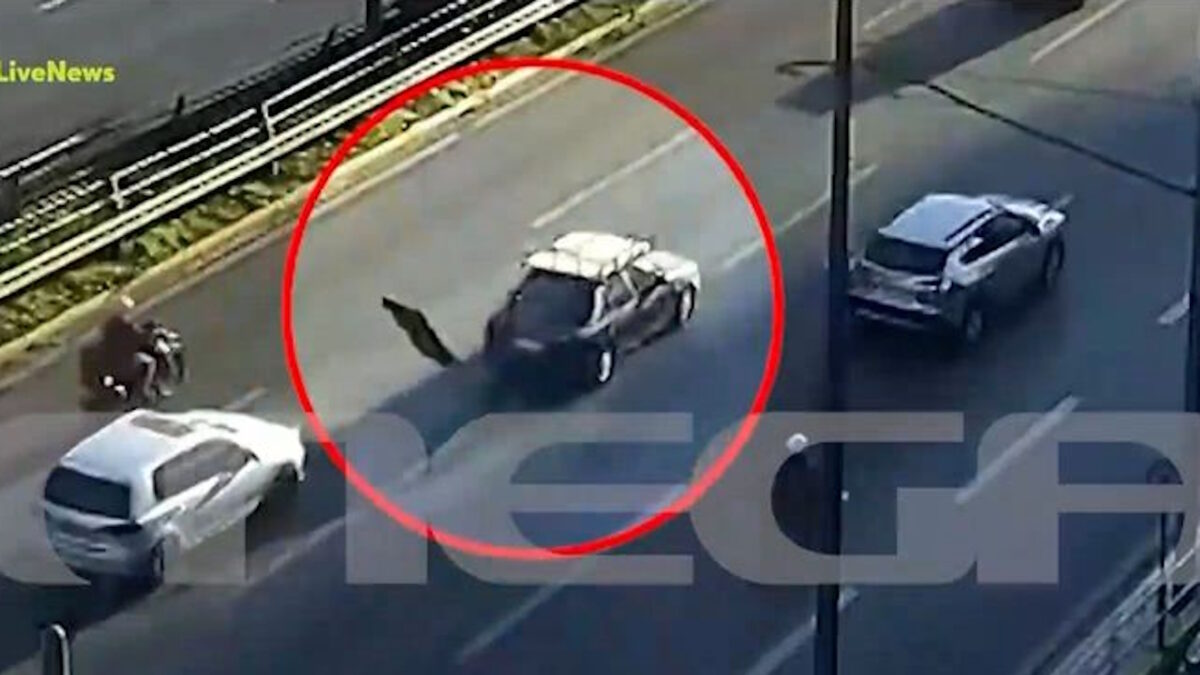 Όπως φαίνεται στο βίντεο ντοκουμέντο του MEGA, η τηλεόραση «πετάει» από το αυτοκίνητο στο οδόστρωμα, την ώρα που το αυτοκίνητο βρίσκεται στη μεσαία λωρίδα στη λεωφόρο Συγγρού.