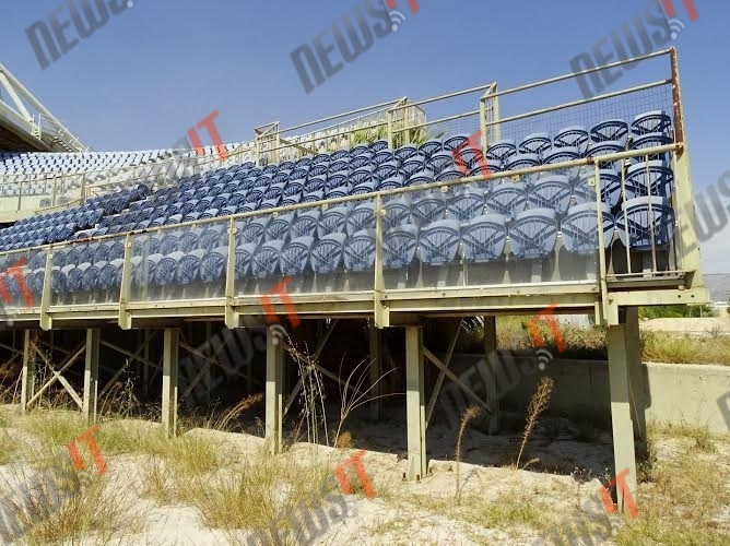 Παρόμοια είναι η εικόνα και στις εξέδρες, όπου η σκουριά και τα φυσικά φαινόμενα έχουν προκαλέσει φθορές στα καθίσματα και τα δημοσιογραφικά θεωρεία ενώ ρημαγμένες είναι τόσο οι ηλεκτρολογικές εγκαταστάσεις όσο και το δίκτυο ύδρευσης του κτιρίου.