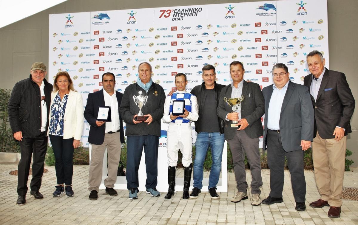 Από αριστερά: Ο Α’ Αντιπρόεδρος του ΟΠΑΠ, Σπύρος Φωκάς, η Πρόεδρος του Δ.Σ. της ΦΕΕ, Ασπασία Ράλλη, ο προπονητής Χρήστος Κουβαράς, ο ιδιοκτήτης Samer Khouri, ο αναβάτης Παναγιώτης Δημητσάνης, ο Αναπληρωτής Διευθύνων Σύμβουλος του ΟΠΑΠ, Οδυσσέας Χριστοφόρου, ο εκπρόσωπος της ιδιοκτησίας Χρήστος Θεοδωράκης, ο COO της Ιπποδρομίες Α.Ε. Κώστας Αλεξόπουλος και ο Αντιπρόεδρος του Δ.Σ. της ΦΕΕ, Γιώργος Παρθένης