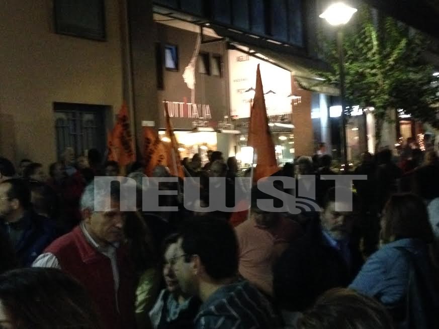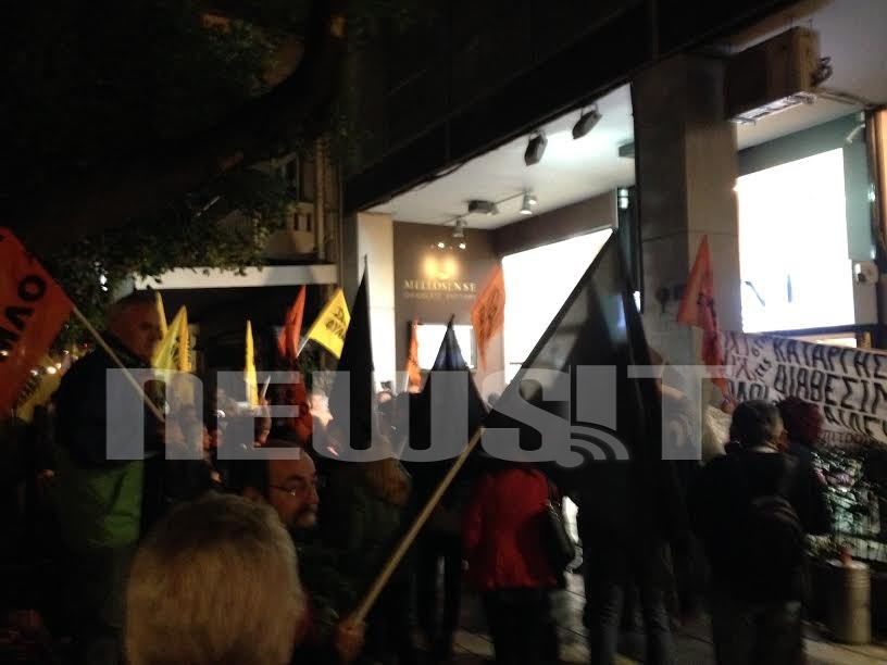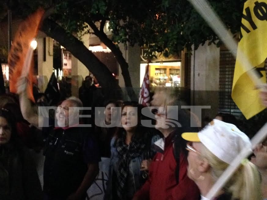 Μάλιστα, μερικοί από τους συγκετρωμένους ανέβηκαν στο γραφείο του Αν. Λοβέρδου και από τα παράθυρα ανέμιζαν τις σημαίες τους.