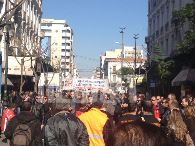 Οι εργαζόμενοι στα Μέσα Μεταφοράς φοράνε μπλούζες που γράφουν “επιστρατευμένος” και ξεκίνησαν την πορεία τους από την πλατεία Κοτζιά.