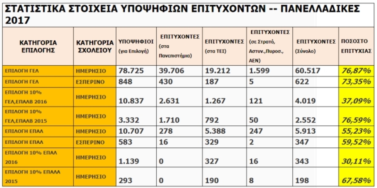 Συνολικά εισήχθησαν στα Πανεπιστήμια, στις Ανώτατες Εκκλησιαστικές Ακαδημίες, στα ΤΕΙ, στις Στρατιωτικές και Αστυνομικές Σχολές και στις Ακαδημίες της Πυροσβεστικής και του Εμπορικού Ναυτικού 74.511 υποψήφιοι, ενώ το 2016 εισήχθησαν 72.973.