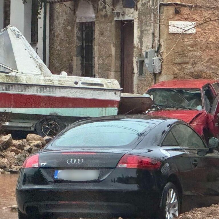 Οχήματα και βάρκες παρασύρθηκαν από τη δύναμη του νερού, με αποτέλεσμα να έχουν μετακινηθεί προς διάφορες κατευθύνσεις.