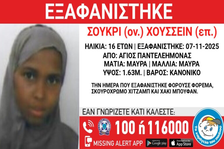 Συναγερμός έχει σημάνει στο «Χαμόγελο του Παιδιού» και στον Άγιο Παντελεήμονα μετά την εξαφάνιση της 16χρονης Σούκρι Χουσσεΐν από χώρο φιλοξενίας της περιοχής.
