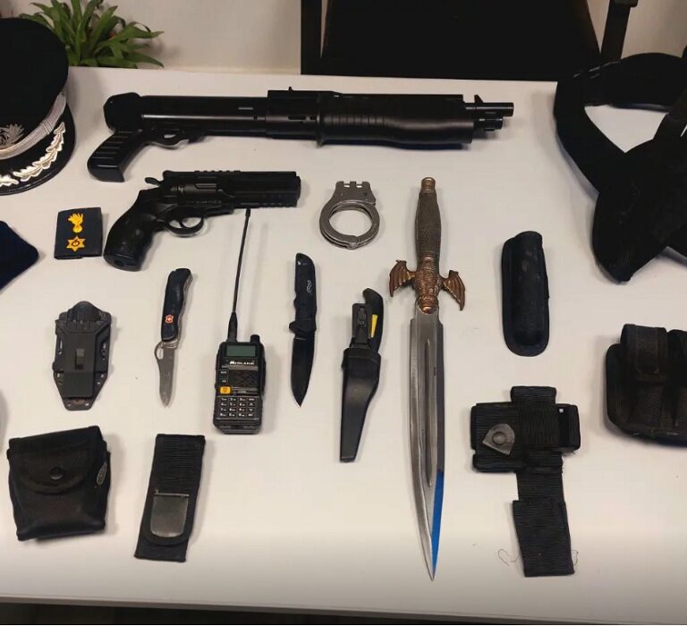 Επίσης στην κατοχή του εντοπίστηκαν αεροβόλα όπλα, μαχαίρια, ξίφος, χειροπέδες κ.α.