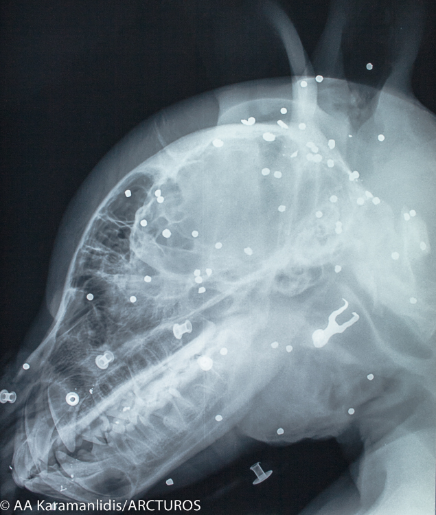 Ο “Γιώργος” μεταφέρθηκε, προχθές, από την Ομάδα Άμεσης Επέμβασης του Αρκτούρου στη Μονάδα Εξωτικών και Άγριων Ζώων και στη Μονάδα Αναισθησιολογίας και Εντατικής Θεραπείας της Κτηνιατρική Σχολής του ΑΠΘ για τις απαραίτητες εξετάσεις. Έπειτα από κλινική εξέταση και τη λήψη ακτινογραφιών διαπιστώθηκε κρανιοεγκεφαλική κάκωση, ενώ παράλληλα βρέθηκαν και άφθονα βλήματα πυροβόλου όπλου στην περιοχή της κεφαλής και του θώρακα.