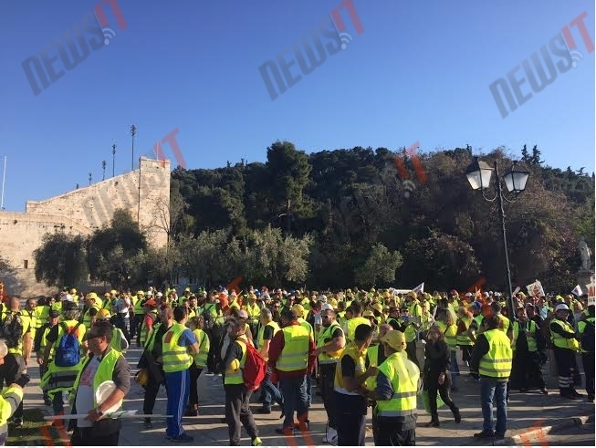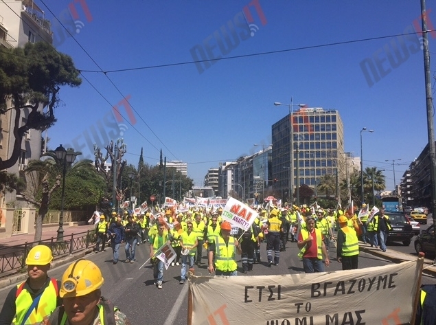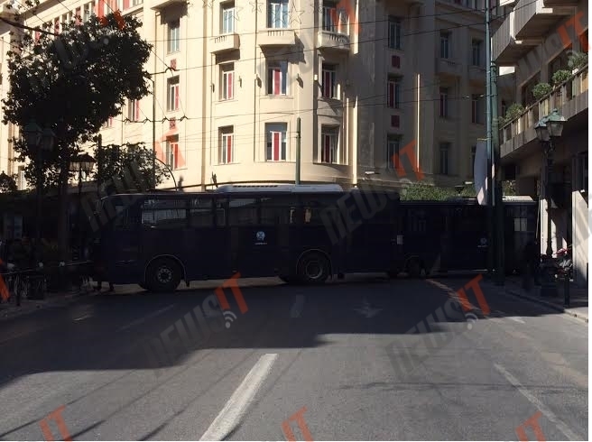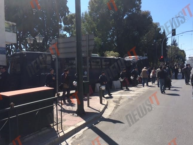 Έντονη είναι η παρουσία των ΜΑΤ στους κάθετους δρόμους της πορείας, ενώ ο όγκος της διαδήλωσης καλύπτει το κομμάτι από τη Βουλή μέχρι και το ξενοδοχείο Μεγάλη Βρετανία.