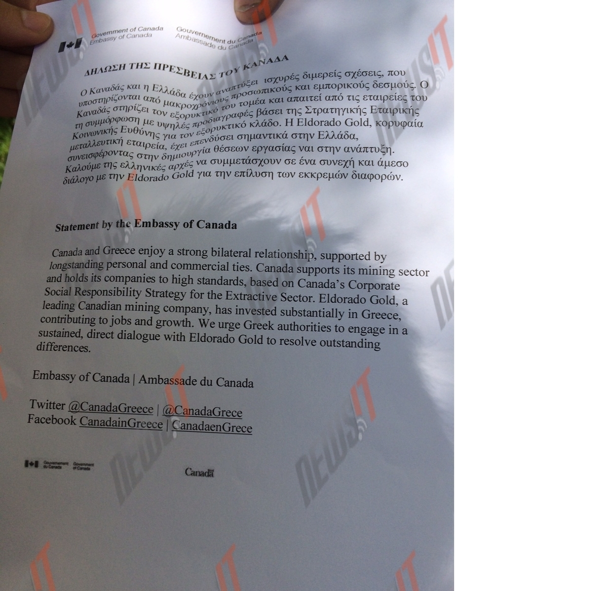 Νωρίτερα, ύστερα από συγκέντρωση έξω από το υπουργείο Παραγωγικής Ανασυγκρότησης, στη λεωφόρο Μεσογείων, εκπρόσωποι των σωματείων εργαζομένων στα μεταλλεία Χαλκιδικής και εκπρόσωποι των τοπικών φορέων της περιοχής είχαν συνάντηση με τον αναπληρωτή υπουργό Περιβάλλοντος Γιάννη Τσιρώνη και τον γενικό γραμματέα Ενέργειας και Ορυκτών Πρώτων Υλών Αποστόλη Αλεξόπουλο.
