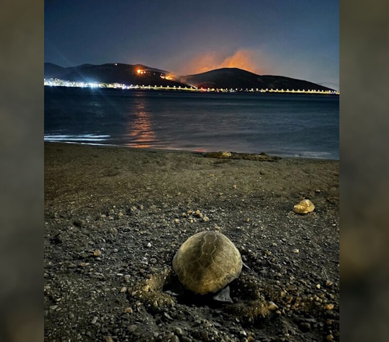 Στα συγκλονιστικά ντοκουμέντα φαίνεται η χελώνα να γεννά ενώ μπροστά της, το πύρινο μέτωπο έχει σκεπάσει όλη την Κερατέα