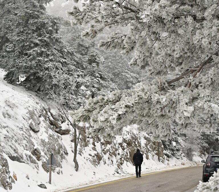 Στα λευκά ντύθηκαν την Πέμπτη (21.02.2025) η Πάρνηθα και η Πεντέλη, καθώς ξεκίνησαν να πέφτουν χιόνια και σιγά σιγά να το στρώνει.