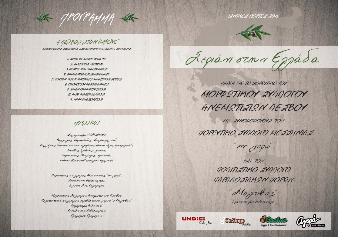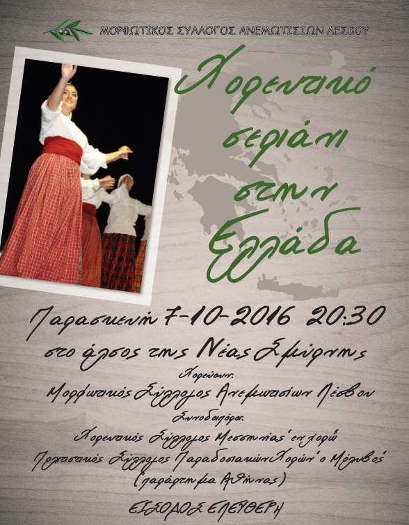 Ο Μορφωτικός Σύλλογος Ανεμωτισίων Λέσβου και το χορευτικό του σας προσκαλεί την Παρασκευή 7/10/2016 στις 20:30 στο άλσος της Νέας Σμύρνης για ένα Χορευτικό σεριάνι στην Ελλάδα με συνοδοιπόρους σε αυτό το ταξίδι τον Χορευτικό Σύλλογο Μεσσηνίας "εν χορώ" και τον Πολιτιστικό Σύλλογο Παραδοσιακών Χορών "ο Μόλυβος" (παράρτημα Αθήνας).
