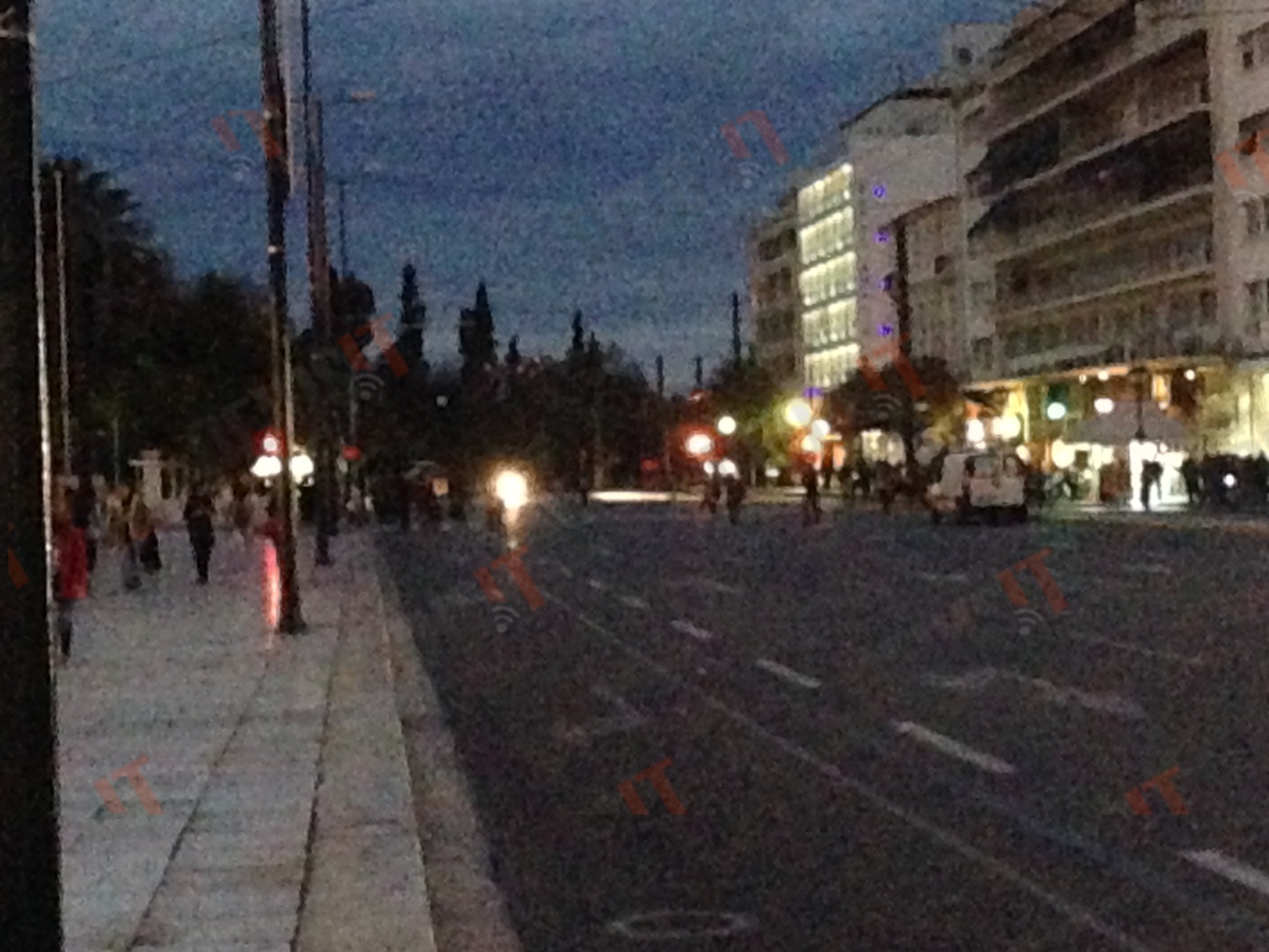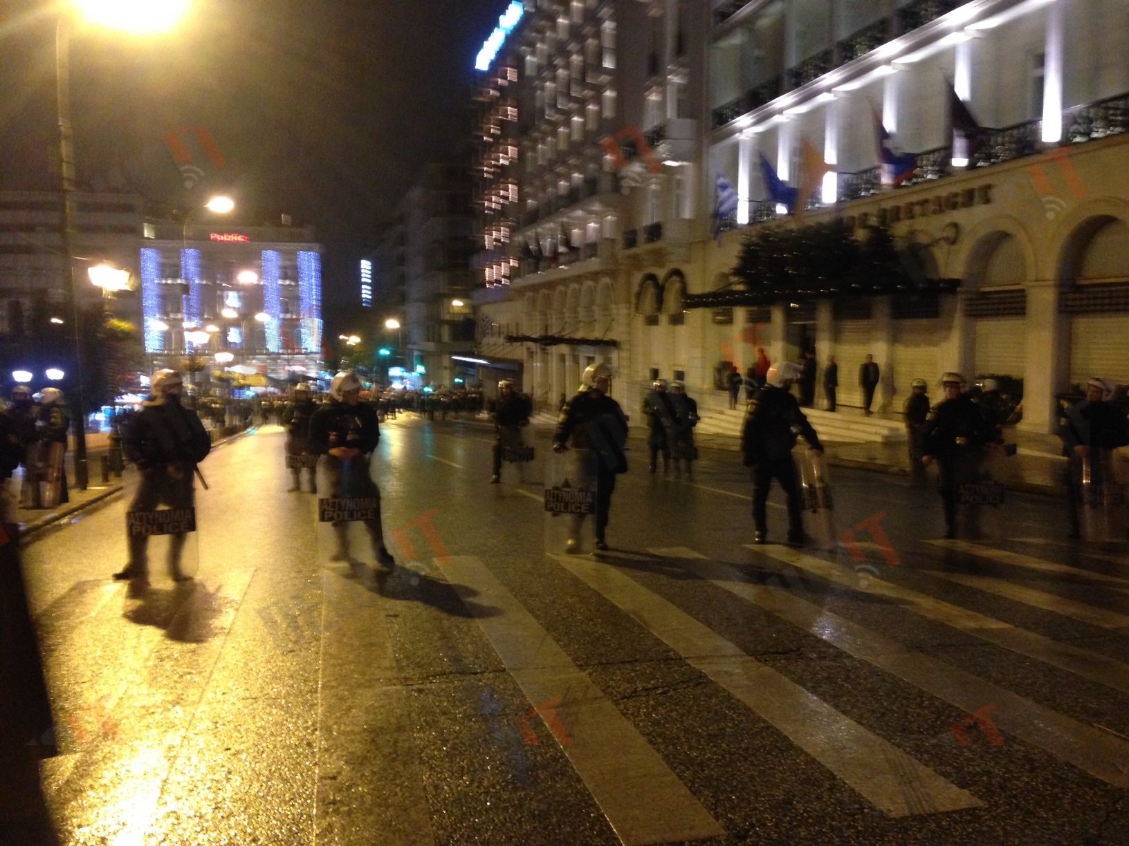 Διμοιρίες των ΜΑΤ έχουν παραταχθεί επί της Γεωργίου Α, μπροστά από το ξενοδοχείο Μεγάλη Βρετάνια.
