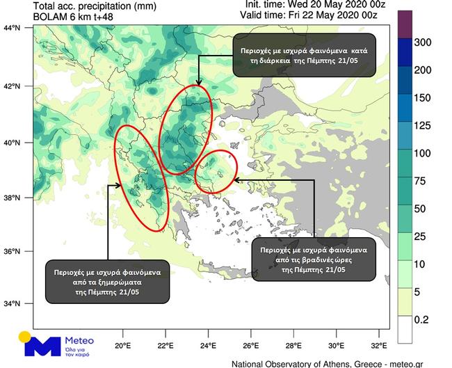 Κατά τη διάρκεια της Πέμπτης 21/05 ισχυρές βροχές και καταιγίδες θα εκδηλωθούν σε μεγάλο μέρος της ηπειρωτικής χώρας, συμπεριλαμβανομένης της Θεσσαλονίκης, φαινόμενα που μέχρι το βράδυ της Πέμπτης θα επεκταθούν στην Εύβοια, στις Σποράδες και ενδεχομένως στη Βόρεια Αττική.
