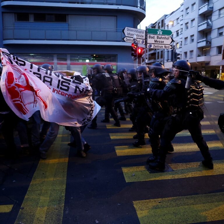 Pro-Palestinian demonstrators lie in front of police officers during a protest, on the day of the Grand Final of the 2025 Eurovision Song Contest, on a bridge over the Rhine river, in Basel, Switzerland, May 17, 2025. REUTERS