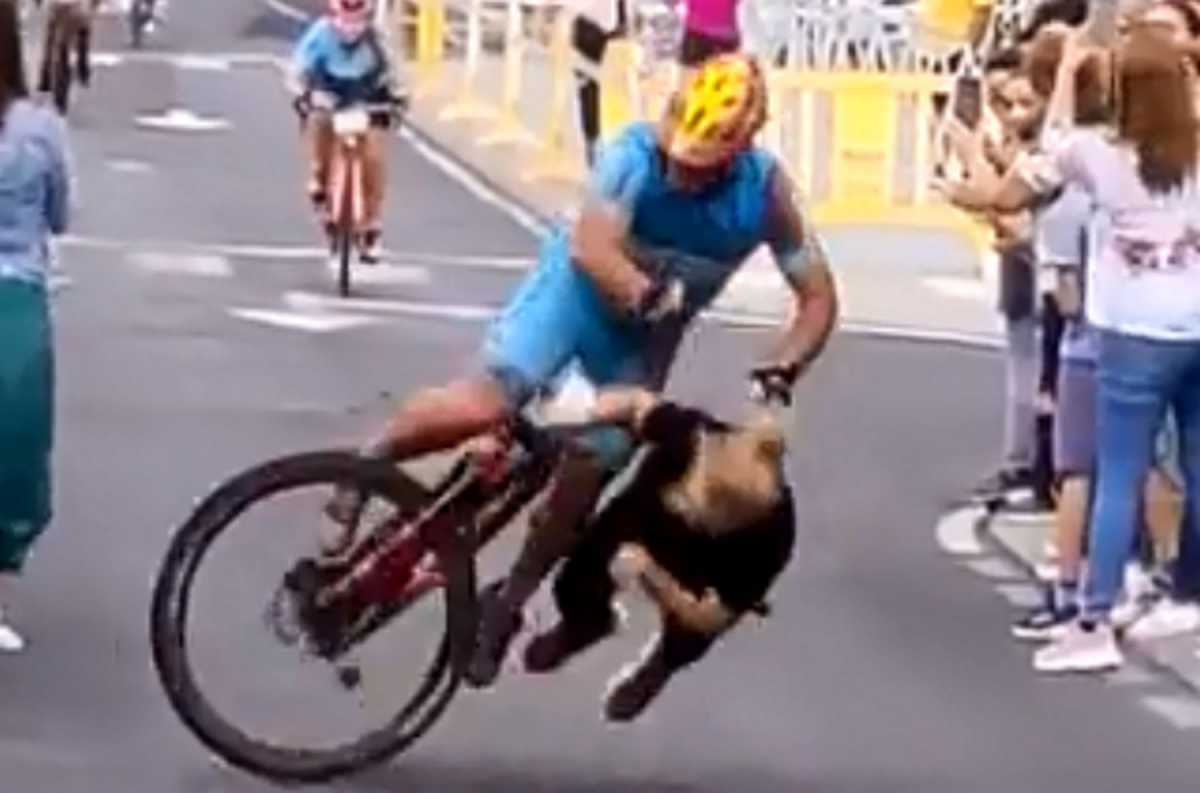 Κυριολεκτικά στο νήμα, ο ποδηλάτης ήταν έτοιμος να πάρει τη νίκη στον αγώνα ποδηλασίας Condaca Salmor στην περιοχή El Hierro στα Κανάρια Νησιά, όταν είδε ξαφνικά μπροστά του τη γυναίκα θεατή, η οποία φάνηκε πως ήθελε να περάσει απέναντι για να τραβήξει φωτογραφίες και βίντεο και συνέβη το ατύχημα.