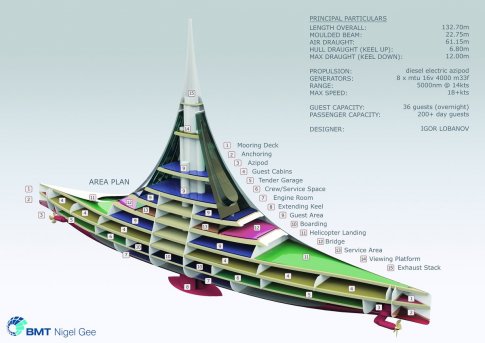 Η ιδέα ανήκει στον Ρώσο σχεδιαστή Ιγκνόρ Λομπανόφ, ο οποίος σχεδιάζει πολυτελή γιοτ για πολύ γερά πορτοφόλια, “Η ιδέα ήρθε πραγματικά μέσα από τα αστέρια. Το σχήμα του είναι τέτοιο, που ταξιδεύοντας μέσα στη θάλασσα, θα φαίνεται στο νερό η απεικόνιση ενός αστεριού”, δήλωσε ο αρχιτέκτονας του πλοίου.