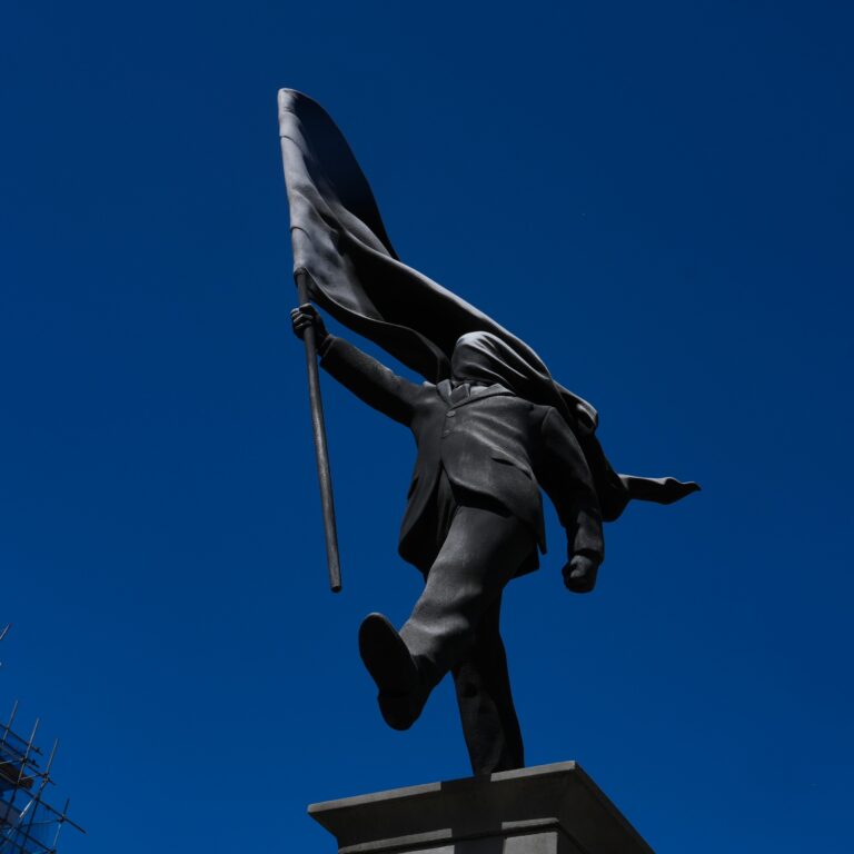 Το άγαλμα του Banksy στο κεντρικό Λονδίνο δείχνει το γλυπτό ενός άνδρα με κοστούμι που περπατάει μπροστά ενώ κρατάει μια σημαία με το ένα χέρι που καλύπτει και το πρόσωπό του, εντοπίστηκε για πρώτη φορά στην εκκλησία του Αγίου Ιακώβου.