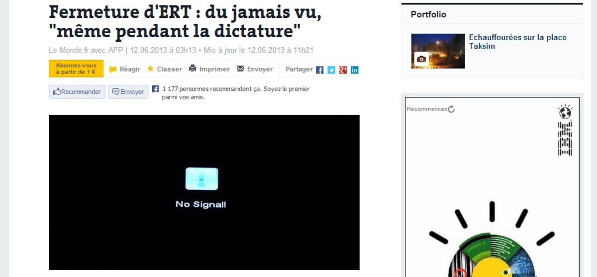 “Θυμάστε τη γενική κατακραυγή που ξεσήκωσε το 2008 η αναγγελία του Νικολά Σαρκοζί περί κατάργησης των διαφημίσεων μετά τις οκτώ το βράδυ στα δίκτυα της κρατικής France Télévisions; Φανταστείτε τι θα συνέβαινε αν ο Φρανσουά Ολάντ ανακοίνωνε την ολοκληρωτική κατάργηση του γκρουπ…”, διερωτάται σε δημοσίευμά της, η γαλλική έκδοση της εφημερίδας “Huffington Post” με τίτλο “Η δημοκρατία έχασε μία φωνή – Τέλος η ΕΡΤ – Στοίχιζε πολύ”.