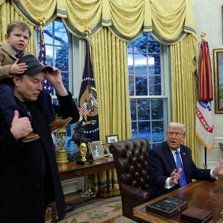 Ο Μασκ εμφανίστηκε με τον 4χρονο γιο του να τριγυρνάει πλάι του μέσα στο Οβάλ Γραφείο, να σκαρφαλώνει στους ώμους του ή να σκαλίζει τη μύτη του ενώ ο ίδιος στεκόταν δίπλα στον Τραμπ την ώρα που ο Αμερικανός πρόεδρος υπέγραψε το διάταγμα με το οποίο ζητεί από τις ομοσπονδιακές υπηρεσίες να συνεργαστούν στενά μαζί του.
