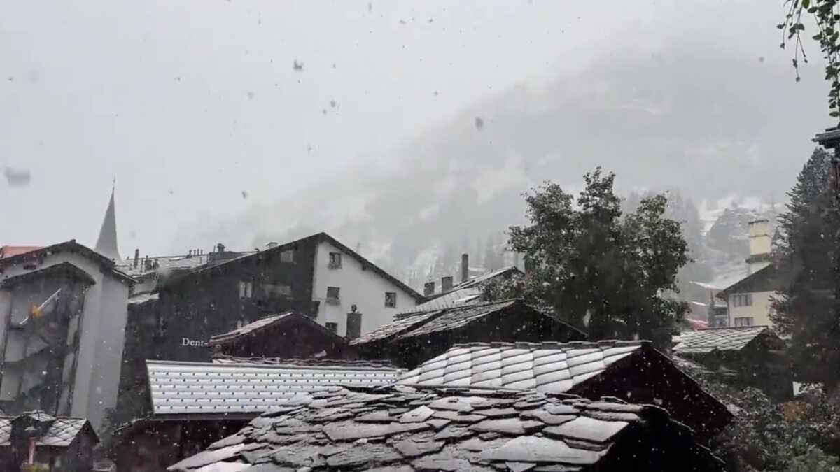 Il neige ce lundi matin à Zermatt (1638 m) ! La température a marqué un recul drastique en 4 jours. Jeudi, le thermomètre de la station mesurait 31.2 °C. Ce matin à 11h15, on relève 0.5 °C. La limite pluie/neige se situe entre 2000 et 2400 m dans le reste des Alpes suisses. pic.twitter.com/N86vCfvf2R